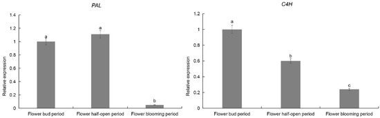 Expression patterns of PAL and C4H at three different flowering period in high-scent D. loddigesii.
