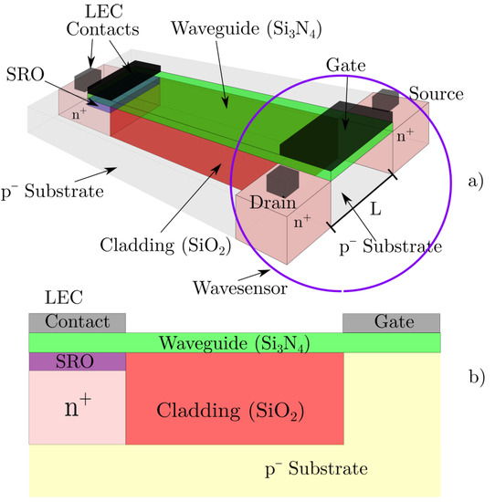 A descriptive schematic of the proposed integrated circuit is presented in Figure 1. This shows the LEC, the waveguide, and the photodetector. As can be seen, the wavesensor is a MIS-like structure, with the insulator being simultaneously an integrated silicon nitride (Si3N4) planar waveguide core, extended into below the gate contact metal.