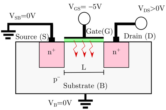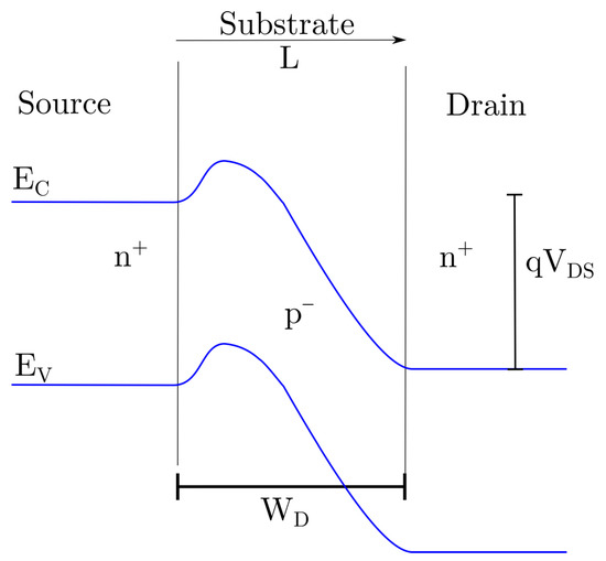 Figure 3c shows the profiles when VDS > VPT and Punch-Through is assured. The substrate region under the gate is fully depleted. If VDS continues increasing beyond VPT, the electric field increases enough to act on the source-substrate junction. The drain voltage induces a reduction of the potential barrier between source and substrate, as depicted in the bottom of Figure 3c. This can be interpreted as an induced forward voltage on this junction. The barrier reduction and the high drain voltage promotes a current flow towards the drain on Punch-Through regime. The current density in the depletion region jSCR is space charge limited, and has been proposed as a main current mechanism in devices working in this regime, as expressed in (4) [30,31,32,33,34]: