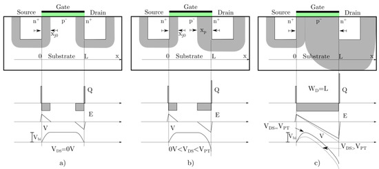 Idealized scheme of the WS showing the charge, electric field and voltage profiles for the WS under thermal equilibrium (a), biased with VDS < VPT (b), biased with VDS ≥ VPT (Punch-Through) (c).