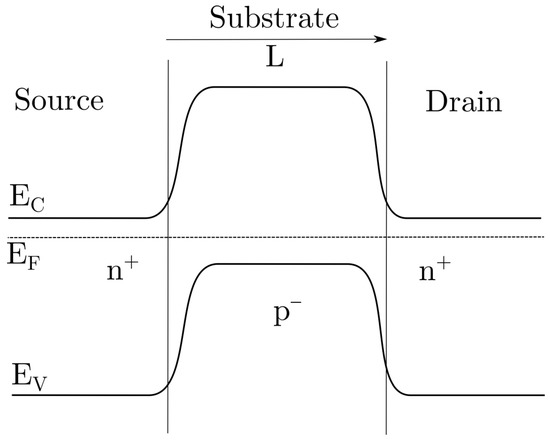 Figure 3a shows the charge (Q), electric field (E), and voltage (V) profiles obtained under equilibrium conditions using the depletion approximation [26,27,28]. Donor and acceptor profiles are assumed to be constant in the N and P zones. The p-n junctions (drain-substrate and source-substrate) are considered abrupt. Under these assumptions, the charges on the depleted zones are as show in Figure 3, and comply with charge neutrality condition (1):