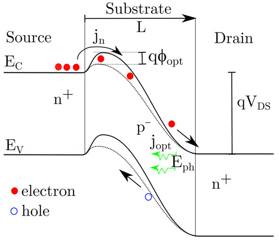 If the drain-source junction is biased beyond Punch-Through condition, and light with an optical power Pin is absorbed by the silicon below the gate area, electron-hole pairs are produced in the space charge region between drain and source. This mechanism is depicted in Figure 6.
