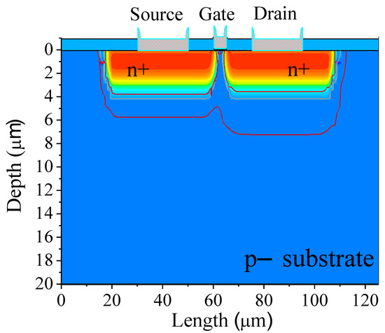 The drain and source diffusions are heavily doped and have a depth junction of around 4 μm. This is due to the thermal treatment necessary in SRO-based light emitters, which is 1100 °C for 180 min [5]. As mentioned, the fabrication process was simulated using these thermal treatment conditions because the device is intended to work with an embedded SRO emitter, for full and monolithic integration.