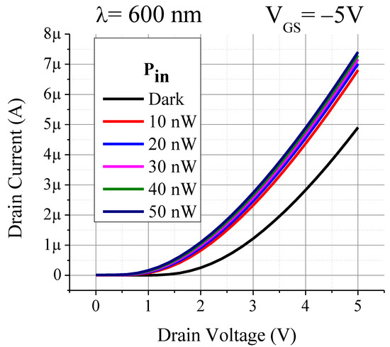 Drain current as function of drain voltage under illumination for different optical powers.