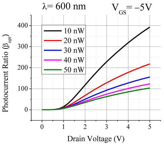 Photocurrent ratio, βopt for different optical power as a function of drain voltage.