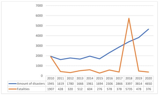 The number of natural hazards, including flood, tornado, landslide, earthquake, forest and land fire, tidal and abrasion and volcanic eruption, as well as their fatalities in Indonesia between 2010 and 2020 [15,16,17,18,19,20,21,22,23,24,25].