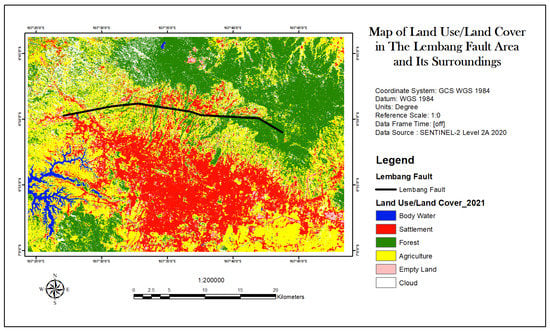 Land use/land cover of the Lembang Fault area in 2021. The coverage of forest between 2020 and 2021 had drastically decreased 116,605 ha, while agricultural land coverage at the same period had increased 35,858 ha. In 2021, the coverage of agricultural land (421,646 ha) was already higher than it of forest (411,644 ha).