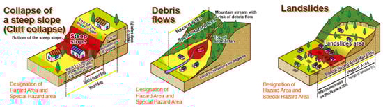 In Japan, the Act on Sediment Disaster Countermeasures for Sediment Disaster Prone Areas was enacted as a legal regulation on sediment disasters. The Sediment Disaster Prevention Act identifies areas whereby sediment disasters are likely to occur and prescribes soft measures, such as the establishment of warning and evacuation systems and structural regulations for buildings. This law was enacted based on the lessons learned from the torrential rains that occurred in the Hiroshima prefecture in 1999, which resulted in 24 fatalities from 325 sediment disasters [48].
