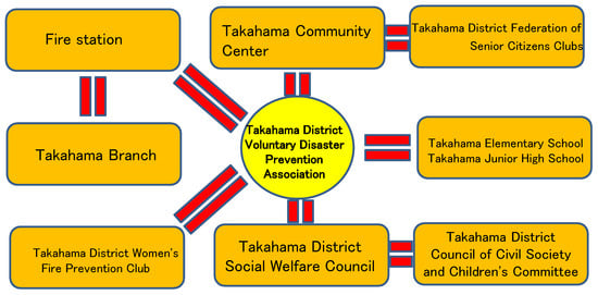 Due to the geographical characteristics of the area, the voluntary disaster prevention organizations in the district took the lead in planning of the operation of evacuation centers and developing the basic rules for evacuation. Such an evacuation was expected to include the participation of the whole community, including primary and secondary schools, police, firefighters, and companies [50]. See Figure 8 for cooperation system based on voluntary disaster prevention organizations.