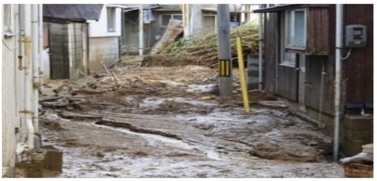 After that, the rain reached its peak from around 10 p.m. to midnight and mudslides, as well as debris flows, which occurred in 35 places in the district before dawn on the 7 July 2018. See Figure 10 for debris flowed into a residential area in the Takahama district. Although it was the first time for the district to experience a sediment disaster, the evacuation was carried out without waiting for instructions from the government and everyone was safe.