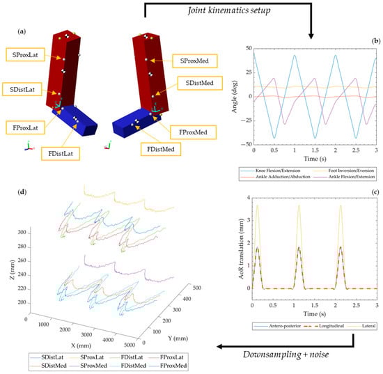 The methodology for the generation of noisy marker trajectories: (a) two views of the multi-body model, with markers on the shank (red) and foot (blue) highlighted, as well as the joint reference frame at the ankle (cyan); (b) the angular motion of the knee and ankle joints; (c) the linear motion of the ankle AoR; (d) downsampled and noisy marker trajectories in the global coordinate system. The plots refer to a generic tri-planar (6 DoFs) motion configuration.