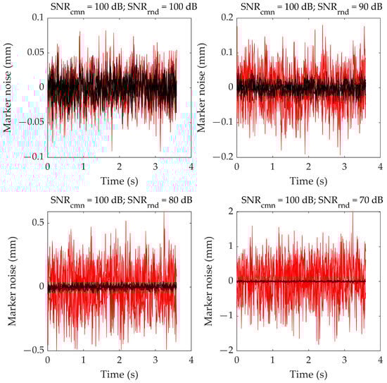 Finally, to simulate the effect of measurement noise from the instrumentation, as well as the artifacts produced by skin sliding and soft tissue, the downsampled coordinates were altered by additive white Gaussian noise. The simplified approach considered was the same adopted by Ehrig et al. [26], which consists of two different sources for the noise signals that can be added to each marker trajectory. In particular, white Gaussian noise is primarily added to each coordinate to simulate random accuracy errors related to the instrumentation and to marker cluster non-rigid deformation. Then, a single white Gaussian noise signal is generated and added to all the markers included in the same cluster. This second source of (common) noise simulates those accuracy errors related to skin sliding that should affect the positioning of each marker within the cluster in the same way (rigid transformations, [15]). This approach is rather a simplified one, since soft tissue artifacts, in particular, have quite different dynamics and depend on the motor task considered [14,16]. However, this method can be considered sufficient to achieve a more realistic representation of the dataset. To define the magnitude of marker noise, the signal-to-noise ratios (SNRs) for the common (SNRcmn) and the random (SNRrnd) sources were included as configurable parameters in the model and can be selected arbitrarily. By default, they are both set at 100 dB. An example of the corresponding noise signals is presented in Figure 2. Figure 1d shows an example of noisy trajectories of shank and foot markers in the GCS, at the end of the generation process.