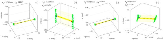 IHA (yellow lines) and MHA (black dashed line) estimation for different motion configurations: (a) 1 DoF, flexion/extension; (b) 2 DoFs, flexion/extension + horizontal displacement; (c) 2 DoFs, helical motion; (d) 6 DoFs, tri-planar motion. Linear (in mm) and angular (in deg) dispersion parameters are reported in each plot. Lateral and medial tips of the exact AoR are represented in red and blue colors, green points are the intersection of the IHAs with two quasi-sagittal planes orthogonal to v axis and located at ±50 mm from the origin of the shank LCS.