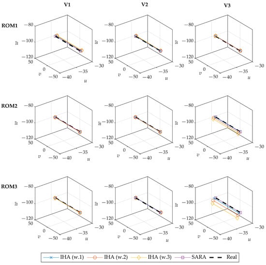 AoRs calculated with MHA, by choosing different weighting factors, and SARA, for motion configuration A. Each row and column correspond to a particular range of motion (ROM) and speed (V) selected, using the same nomenclature detailed in Section 2.3.2. The exact AoR imposed by joint kinematics setup is highlighted in dashed black line. All axes units are in mm.