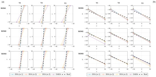 AoRs calculated with MHA, by choosing different weighting factors, and SARA, for motion configuration D. The axes are represented in two views: (a) transverse (horizontal) plane; (b) frontal plane. Each row and column correspond to a particular range of motion (ROM) and speed (V) selected, using the same nomenclature detailed in Section 2.3.2. The exact AoR imposed by joint kinematics setup is highlighted in dashed black line. All axes units are in mm.