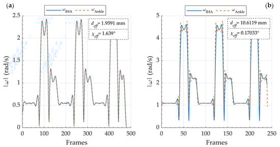 The algorithm for IHA estimation used is based on the original work of Woltring et al. [23], and it has been already outlined in previous works from the authors [10,19]. It considers a screw-like helical motion assumption. Firstly, this procedure requires the transformation of shank and foot markers’ global trajectories in the local coordinate system (LCS) of one of the segments considered, that is, the shank. A representation of the shank LCS used to evaluate IHAs is presented in Figure 3a, whose elements are as follows: