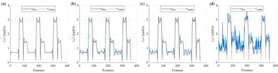 In order to run the model and generate the markers’ trajectories, the complete joint kinematics must be provided as an input; hence, the rotation angle, angular velocity, and angular accelerations of each joint had to be defined in the first place. To this purpose, the three ankle rotation angles were defined as piecewise-defined functions of the gait cycle, by considering ranges of motion and curve trends respectful of natural joint kinematics. The translational DoFs along the antero-posterior, longitudinal, and lateral directions were defined with a similar approach; however, in this case, the ranges of motion were selected arbitrarily due to the lack of specific information from the literature. However, to avoid unrealistic joint configurations, the ranges of the translational DoFs were selected to achieve AoR translations coherent with the linear dispersion of helical axes observed on cadaver specimens [27]. Each ankle DoF signal could be easily varied in terms of magnitude and duration, hence enabling the possibility to test the model for different ranges of motion and speed. Figure 1b,c show the patterns of ankle and knee motion for a general tri-planar motion configuration, which considers 6 active DoFs at the ankle joint. Unlike the ankle joint, the knee, modeled as a simple revolute joint, only requires the definition of the flexion/extension DoF to run the model. The same pattern of knee motion shown in Figure 1b was considered for all the simulations, which always included three full gait cycles. As highlighted in Figure 1b,c, all the DoFs were smoothed by a low-pass filter (Butterworth, 4th order) before they were provided as input to the model to remove the effect of undesired spikes in the velocity and acceleration signals.