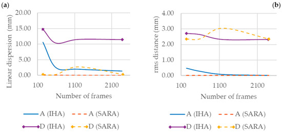 Given the constant sampling rate equal to 100 Hz, an increase in motion speed corresponds to a reduction in the number of frames available to represent each gait cycle. When performing on the lowest number of samples, the IHA algorithm exhibits a relevant decrease in the general performance, even in configuration A, as signaled by the increase in the linear dispersion. Especially for configurations A and B, this effect seems even clearer when the largest ROMs are considered, with the linear dispersion increasing up to 16.7 mm (conf. A) and 27.8 mm (conf. B). Curiously, the linear dispersion of the IHA set observed for configuration B is orthogonal to the horizontal displacement of the exact AoR imposed by the model, as shown in Figure 4b. Regarding the helical motion configuration (C), the IHA algorithm performs similarly for any of the ROMs considered; however, the linear dispersion is still increased and exceeds 10 mm at the highest speed. For the tri-planar motion configuration (D), the IHA algorithm shows similar results in terms of linear dispersion when the narrower ROMs are selected, regardless of the speed selected. However, for the widest ROM, a similar increase in linear dispersion is obtained at highest speed. As far as the rms distance Δ is concerned, the same dependency with the ROM/speed combinations shown for the linear dispersion parameters is observed.