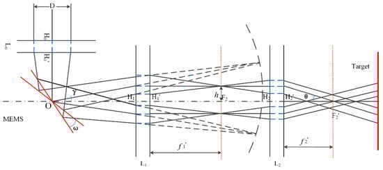 The schematic diagram is shown in Figure 2. Hi and Hi’ are object principal plane and image principal plane of the lens groups, respectively. The laser beam is focused by the cemented lens L0 and completely irradiate into the effective area of the MEMS mirror. After being reflected by the MEMS mirror, the f-θ lens L1 is used to correct the image surface into a plane and focus the beam. Then the laser passes through the symmetrical cemented positive lens group L2, whose object focal plane coincides with the image focal plane of the f-θ lens. So L2 collimates the scanning beam.