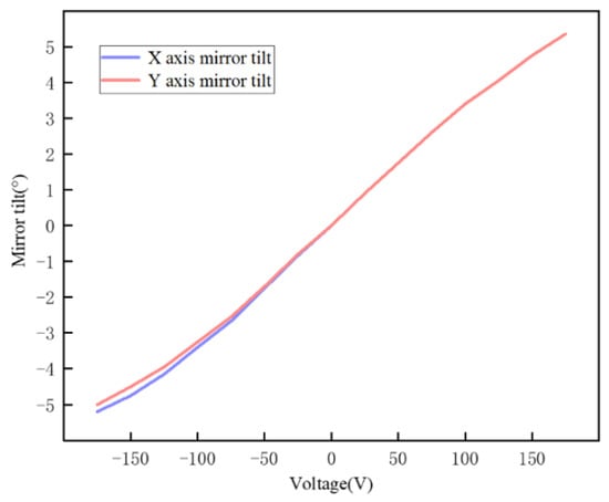 This design uses the MEMS mirror model S40919 manufactured by Mirrorcle. The effective diameter of the mirror is 5 mm, and the rotation range is ±5°. It works based on the principle of electrostatic driving. The relationship between the driving voltage and the tilt angle provided by the mirror manufacturer is shown in Figure 3. The parameters are listed in Table 1.
