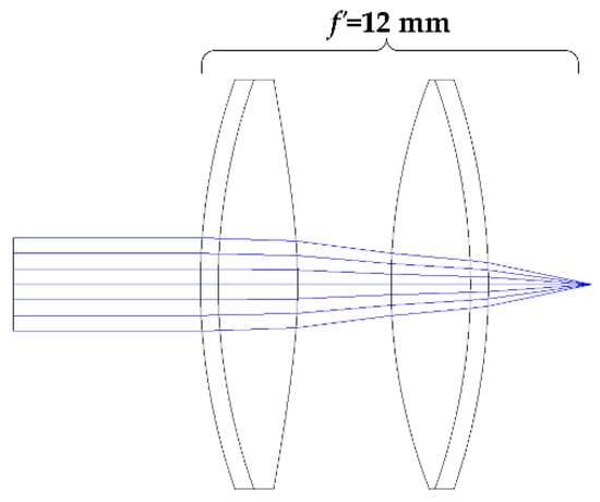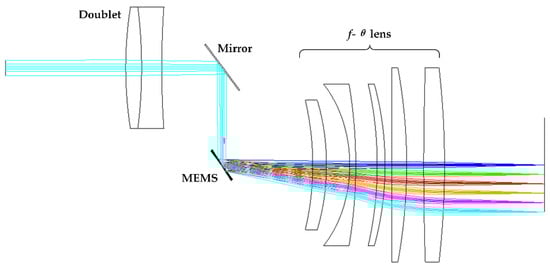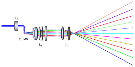 As shown in Figure 2, the laser beam emitted by the semiconductor laser should first be focused by a positive lens to completely illuminate the effective mirror surface without causing beam leakage. A double cemented lens L0 with a focal length of 80 mm is used to eliminate spherical aberration. The object distance between the laser source and L0 is 1207 mm. Therefore, the image height D of the spot incident on the cemented lens does not exceed 2 mm, which can ensure that all the laser beams passing through L0 focusing on the MEMS mirror surface. A flat mirror is adding between the doublet lens and the MEMS mirror to change the propagation direction of the light path and improve the utilization of the actual system internal assembly space.