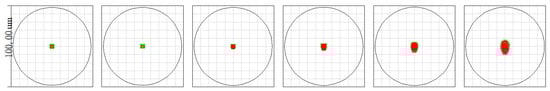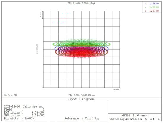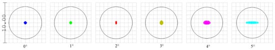 Setting the image distance to be 100 m, the point diagram distributions when the MEMS mirror rotates from 0° to 5° can be obtained as shown in Figure 9. The distribution of the spots are generally uniform and symmetrical, and are all within the Airy disks. When the MEMS mirror rotates from 0° to 5°, the corresponding spot RMS radius is maximum.