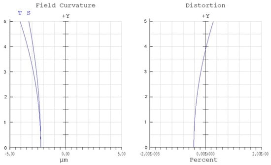 Figure 6 shows the field curvature and distortion diagram of the optimized f-θ lens. It can be seen that the relative distortion is less than 0.5%, which satisfies the design requirement. The linearity of the optimized f-θ lens system is very high.