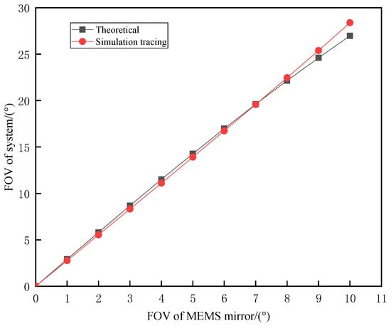 According to Equation (3), the theoretical FOV of the system with various angles can be calculated. The results obtained by ZEMAX ray tracing compared with that of the theoretical calculation are shown in Figure 11. The linear fitting shows that the FOV extending factor for the designed system is about 2.78, which is 2.56 according to the theoretical calculation. The difference between the simulation results and the theoretical calculation increases with the FOV, but the maximum error does not exceed 1.41°, showing excellent agreement. When the rotation angle of the MEMS mirror is 5°, the FOV of the system is the largest, which is 28.5 × 2 = 57°, and the maximum beam divergence is less than 0.5 mrad. The total length of the optical system is less than 12 cm. Compared with the traditional optical angle expansion system, our new design has distinct advantage in the FOV, which is usually less than 30° in real existing LIDAR system.