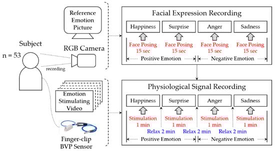 The subjects were asked to express a total of four emotions—happiness, sadness, anger, and surprise—for 15 s per expression, as shown in the reference picture in Figure 1. In this procedure, the reference picture was provided to the subjects in advance, and the subjects made their facial expressions as imitating the reference picture. Additionally, the subjects’ facial expressions were totally recorded. When the experiments acquiring facial expressions ended, four videos showing emotions were watched for 1 min. We defined happiness and surprise as positive emotions and sadness and anger as negative emotions. While the subjects were showing emotional expressions, their facial expressions were recorded using a camera, and the BVP signal was measured while watching the video. The device used in the experiment was a BVP finger-clip sensor of NeXus-10 MKII of Mind Media, and the frame rate of the camera used to record the facial expressions was 30 frames/s. To stimulate the participants, video clips expressing happiness, surprise, anger, and sadness were played, in that order, for 1 min. The corresponding video clips used in the experiment were from the movies About Time (2013), Capricorn One (1977), The Attorney (2013), and The Champ (1979). The overall procedure of the experiment is shown in Figure 2.