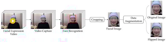 The amount of acquired data was from a total of 53 subjects, with an image rate of 30 frames/s, a time duration of 15 s, and two out of four emotions considered as negative emotion and positive emotion, respectively. The number of data points was approximately 47,700, and this number doubled when data augmentation was performed. Finally, the number of images obtained was approximately 190,000 (53 × 30 × 15 × 2 × 2 × 2), but only 157,000 facial expression image data were used, excluding inappropriate data through handcrafted filtering. The preprocessing procedure of image data is presented in Figure 3.