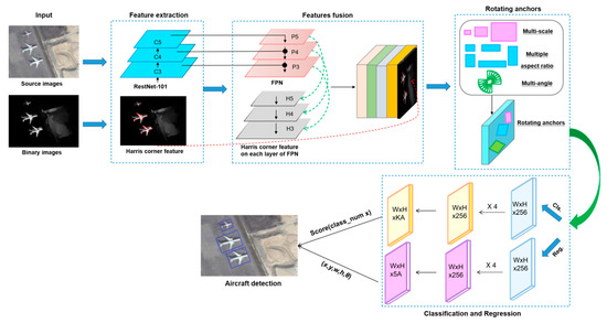 Overview framework of multi-feature fusion with rotating anchors generation mechanism for oriented aircraft detection. The proposed framework based on FPN, fuses multi-scale features from different CNN layers and integrates Harris corner features which extracted from binarized feature maps of FPN.