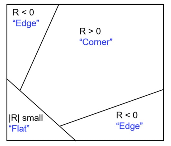 - The value of corner response R of each pixel in the image can be calculated by:where Det(M) represents the matrix determinant of M, Tr(M) is the trace of M, the k is empirical constant which generally take the value 0.04–0.06. The local non-maximum suppression of R is carried out. That is, retain the points whose values are the local maximum and greater than the threshold T, reset the values of the other points to zero. These non-zero points are corners. Threshold T is generally 10−2 times of the global maximum response value, and the smaller the T value is, the more corner points are retained. As shown in Figure 2, the measure R with a large positive value indicates the presence of a corner; R with a large negative value indicates an edge; a small absolute value |R| indicates a flat area.