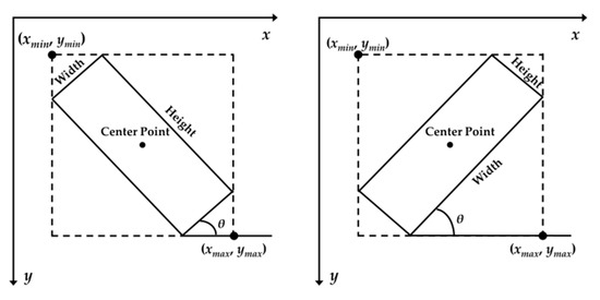In the prediction stage of the sub-network, the traditional horizontal bounding box (dashed box) is usually represented by xmin, ymin, xmax, and ymax; based on these four parameters, the bounding box regression transformation is performed to obtain the predicted bounding box, but it cannot well cover the aircraft in different directions. Therefore, the representation of rotating bounding box (solid wireframe) is defined, which is not only controlled by scale and aspect ratio, but also by direction. Five variables (x, y, w, h, and θ) are used to uniquely determine a bounding box in any direction, as shown in Figure 3. Where x and y represent the coordinates of the center point, respectively, θ represents the angle between the horizontal axis and the first side of the rectangle, and the range of the angle is [−90°, 0°].