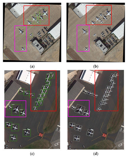 Visualization of aircraft detection results of proposed method on OBB in (b,d) and HBB method in (a,c).