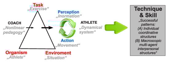 On the individual level, the biomechanics of the sports-specific skills “drive” shot and “feint” shot (with a waving movement of the throwing arm) were investigated predominantly under isolated training conditions [,]. This research revealed that the personal differences in throw performance between the players do not primarily result from ball speed. This leads to the assumption that in competition environment and task constraints (Figure 1) of the skill execution are much more important for the goal throw performance compared to organismic strength alone.