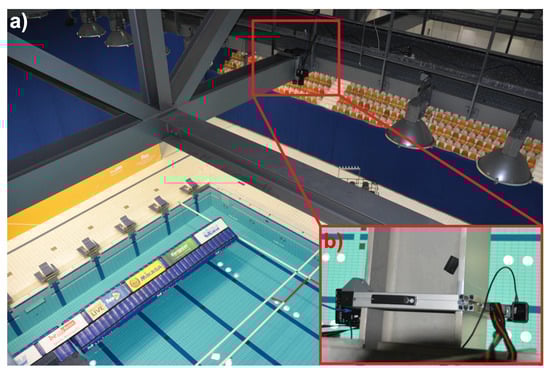 (a) Experimental setup: two cameras filmed the games 13 m above the water surface. (b) The smaller camera GoPro (right side) and the high-speed camera on the left side.