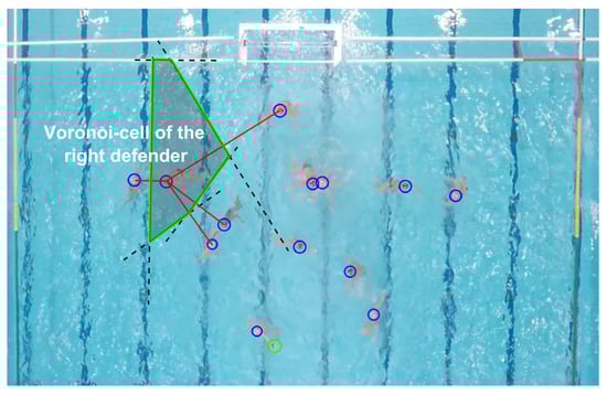 Generally speaking, when scoring a goal in most sports games, the throwing result primarily depends on the distance to the nearest opponent [,]. In addition to this elementary variable, and in line with the key performance indicator local dominance [] the top international water polo teams try to increase their control of space in front of the opponent’s goal primarily through quick position changes (e.g., in the form of vertical penetrations, diagonal crosses, and horizontal swims “into the box” from the outside, etc.) in the attack. To do this, each player must optimize several spatial distances at the same time in his playing position or in his attacking zone, i.e., not only to the nearest defenders, but also to his teammates in terms of the best possible throwing situation for himself or a teammate []. As the present study has shown, that superior space control both in the positional attack (6-vs.-6) and in its defense leads to a significantly higher rate of goal scoring or goal prevention. The attacking teams when scoring goals with six field players controlled on average a space in front of the opponent’s goal which was about 32.0 m (±3.0 m) larger than the space controlled by the six defenders together with their goalkeeper. Conversely, the successfully defending teams controlled a pitch area in front of their own goal that was also larger by 24.0 m (±2.0 m) when they thwarted a goal against. The same (preliminary) findings emerge for the outnumbered attack (6-vs.-5) and the man-up attack (6-vs.-5) and the man-down defense (5-vs.-6), respectively, although here the absolute size of the Voronoi-cells controlled by the two teams is smaller, as expected, due to the power play set-up.