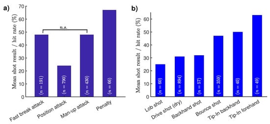 The different hit rates (a) for the four typical team attack phases ( = 38.51; p < 0.001; Bonferroni post-hoc, p < 0.05) and (b) for the six different shot techniques.