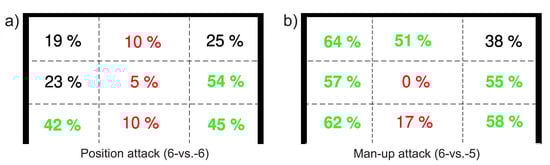 Overall hit rates of all players participating in the water polo World Cup Final 2018 in the different target zones of the water polo goal (separated for (a) position attack and (b) man-up attack situation of the team).