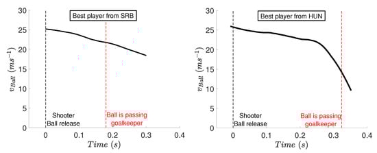 As a result, both penalty throw (from the 6 m line) and throw from the field showed very high release speeds, some of which were over 25 ms. Thereby, the top performers were one player of the 2016 and 2020 Olympic champion Serbia with faster than 27 ms and one player from Hungary with faster than 26 ms. At these shot speeds, the reaction time of the goalkeeper (time between t3, leaving the ball from the hand, to t4, passing goalkeeper’s position) was less than 0.2 s in individual cases (Figure 6).