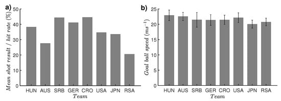 (a) Hit rates of the eight nations participating in the 2018 World Cup Final (in order of tournament placement). (b) Team comparison of ball speed (at time t3, leaving hand; ; p < 0.001) during goal completion with drive shot.