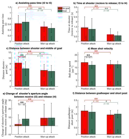 Partial collective tactical analysis of selected characteristics of attacking behavior during goal completion with Cohens’ d and significances (☆ stands for p < 0.05 and for p < 0.01), separated into positional and man-up attack including following conditions: (1) drive shot or bounce shot, (2) free shot, (3) direct and feint shots and (4) without shot faults.