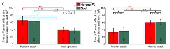 Collective-tactical analysis of the space control during goal throw for the (a) defending and (b) attacking team defined as the team sum of the individually controlled areas by the six team members (Voronoi-cells within a 15 m × 8 m defined rectangle in front of the goal with Cohens’ d and significances: ☆ stands for p < 0.05 and for p < 0.01).