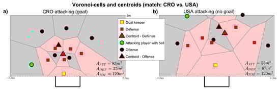 Exemplary collective space control for offense and defense visualized by Voronoi-cells separated in attacking (gray) and defensing (red) zones with the corresponding space control areas and (within the preliminary round game CRO-USA). (a) CRO attacks scoring a goal. (b) USA attacks not scoring a goal.