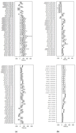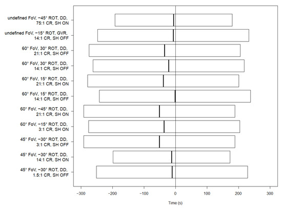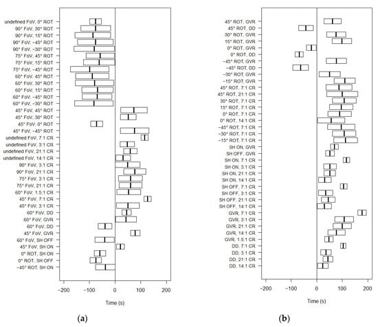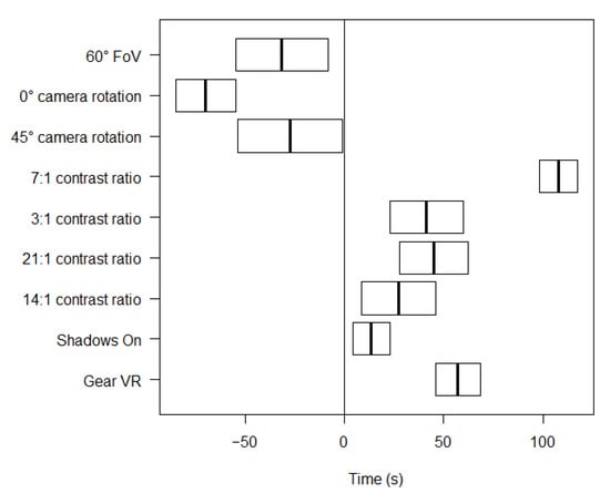 The significant pairs resulting from the comparison can be seen in Figure 3 in the form of 95% CIs. From this point onward, the following new abbreviations are used: ROT for camera rotation, CR for contrast ratio, DD for desktop display, GVR for the Gear VR, SH ON for turned on shadows, and lastly, SH OFF for turned off shadows. As illustrated in Figure 3, there are 75 pairs with significant decreases and increases in completion times. 23 pairs decrease test completion times significantly, while 52 increase them. The largest significant decrease is in the case of 75° FoV and −45° camera rotation, while the largest significant increase is in the case of the Gear VR and 7:1 contrast ratio.