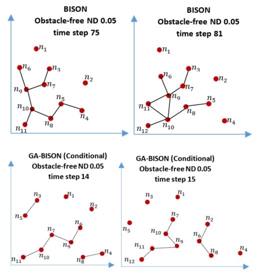 After considering the inherently dynamic nature of BISON and its GA hybrid variant (GA + BISON), we relied on temporal network analysis as a natural enhancement to the discovery and analysis of changes within the networks generated by these algorithms [9]. Voronoi-type algorithms have been utilized for similar purposes, with groups such as Wang et al. developing different methods for node reallocation based on Voronoi edges [10], and Zou et al. introducing a spreading algorithm (NSVA) to deploy a fixed number of nodes within an obstacle free region [11].