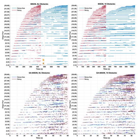 Edge-centric representation of Voronoi-only (BISON) and GA + Voronoi (GA-BISON) in both the obstacle-free environment and obstacle-rich environments. A given simulation has reached the cut-off condition at its rightmost edge. Notice that GA + Voronoi reaches cutoff after a fraction of the time required for Voronoi-only, and how Voronoi-only performs much more quickly in the presence of noise. Furthermore, note the sporadic nature of connections within GA + Voronoi, compared to the stability of Voronoi-only connections. (a,b) Two of the significant empty bands, where connections never form. Table 3 on the next page lists the connections in panels (a,b), we refer to SOM-C for a complete list of all missing pairs, for all panels of this figure.