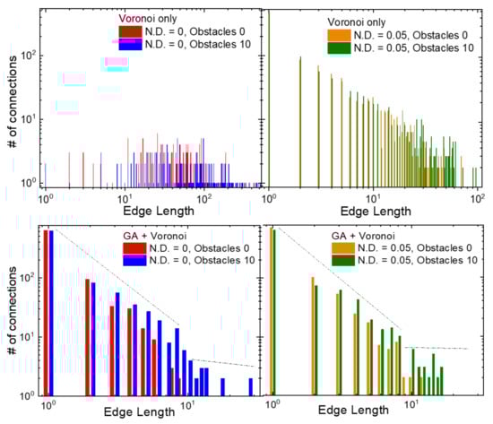Distribution of various lengths of connection for each of the cases in Figure 3. We see a drastic qualitative difference between Voronoi-only in noise-free and noisy environments, and smaller quantitative difference between GA + Voronoi cases.