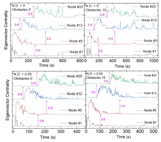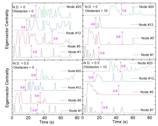 Eigenvector Centralities of the Voronoi-only approach in various environments at different time steps; Vertical bar sign “”, stacked vertically, is common to all curves.