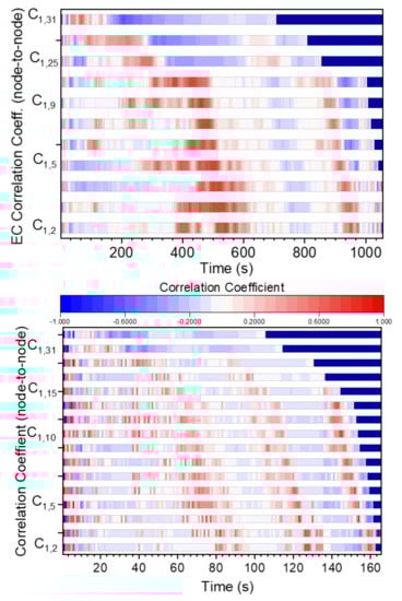 We have analyzed correlations between the eigenvector centrality time traces from Figure 7, using the well-known formula for Pearson’s correlation coefficient, where we have taken the expectation values of our data to be the arithmetic mean of our data sets. For two data sets A and B, the coefficient is